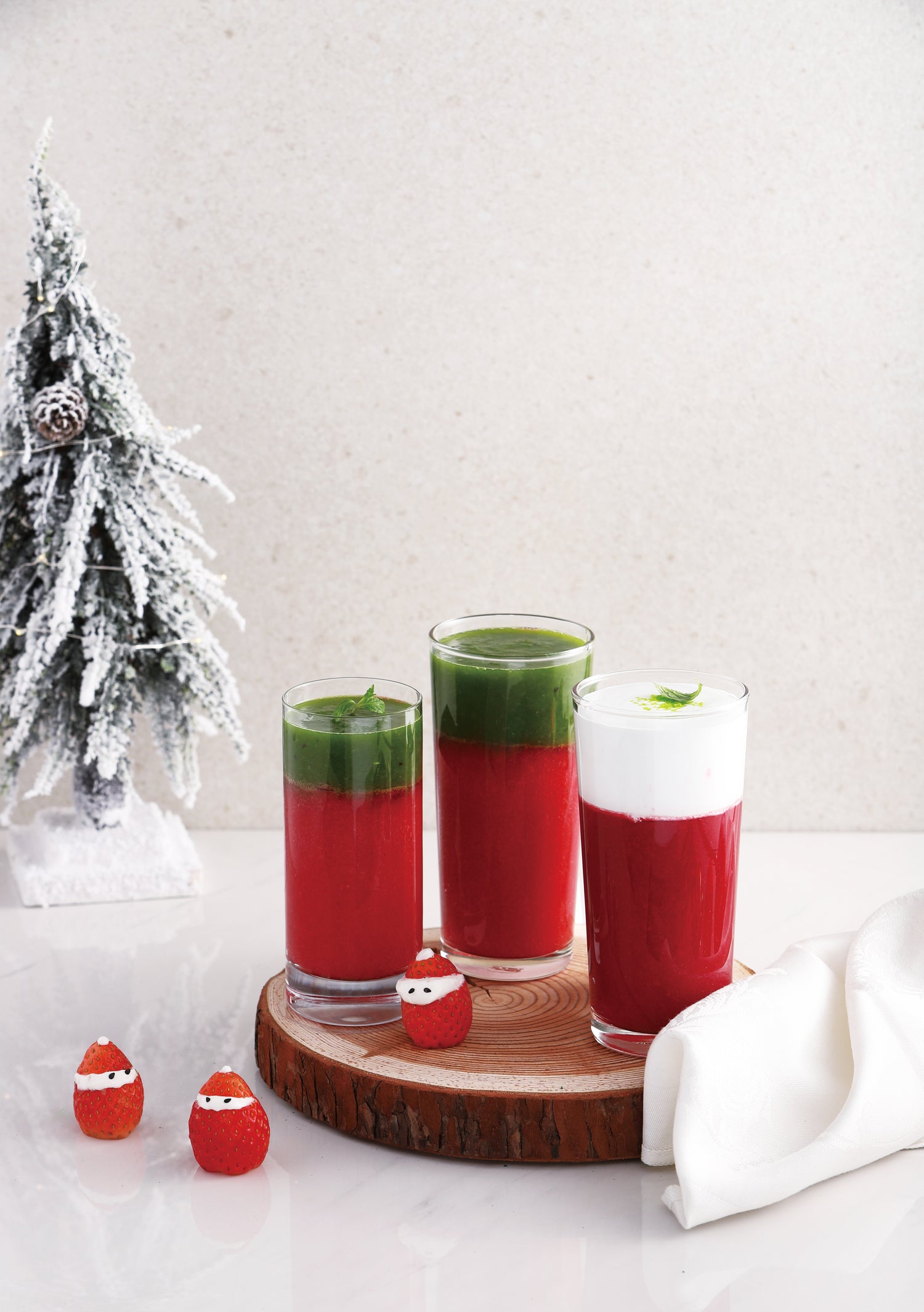Ein farbenfroher, geschichteter Vital-Saft mit erdiger Roter Bete, frischem Spinat und cremigem Pflanzenschaum – voller Nährstoffe und erfrischendem Geschmack.